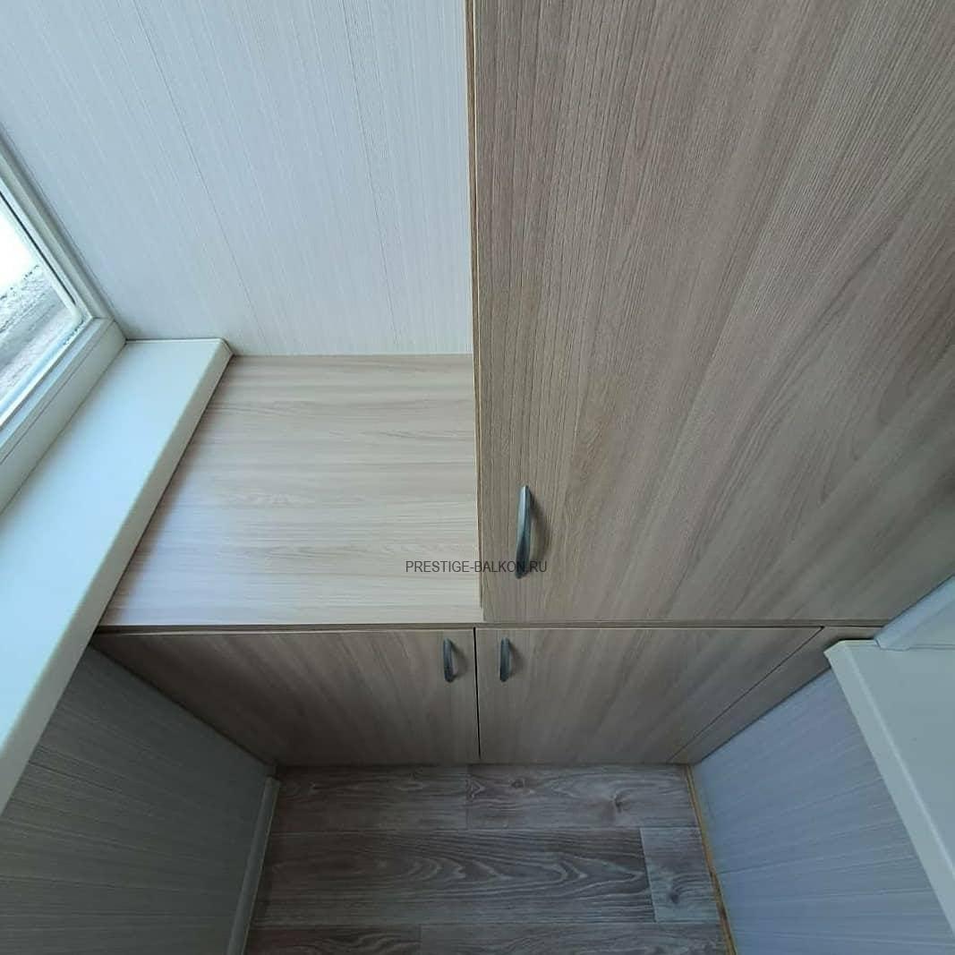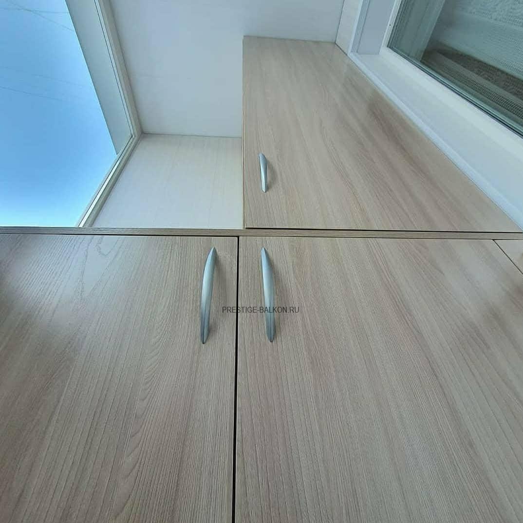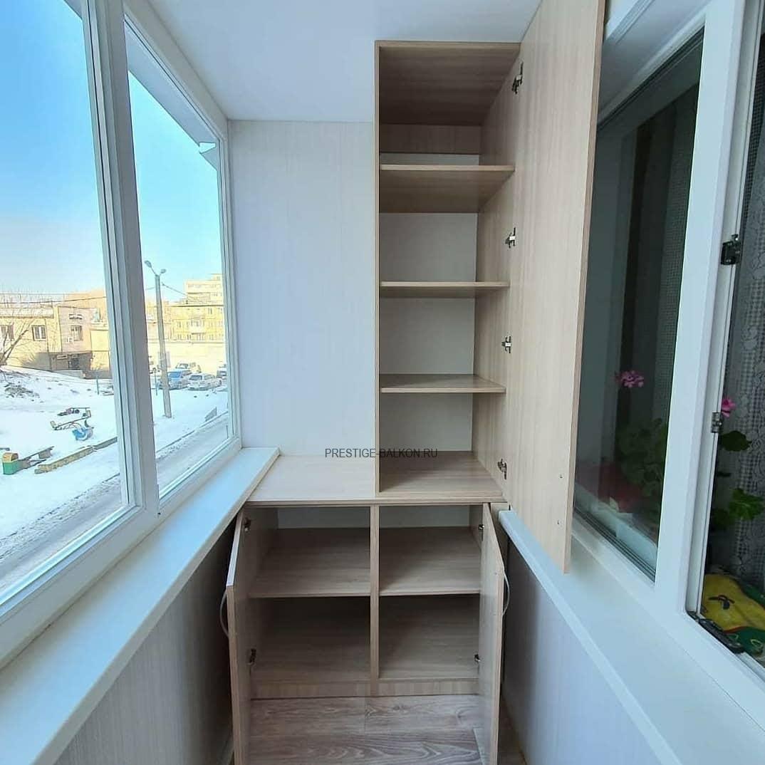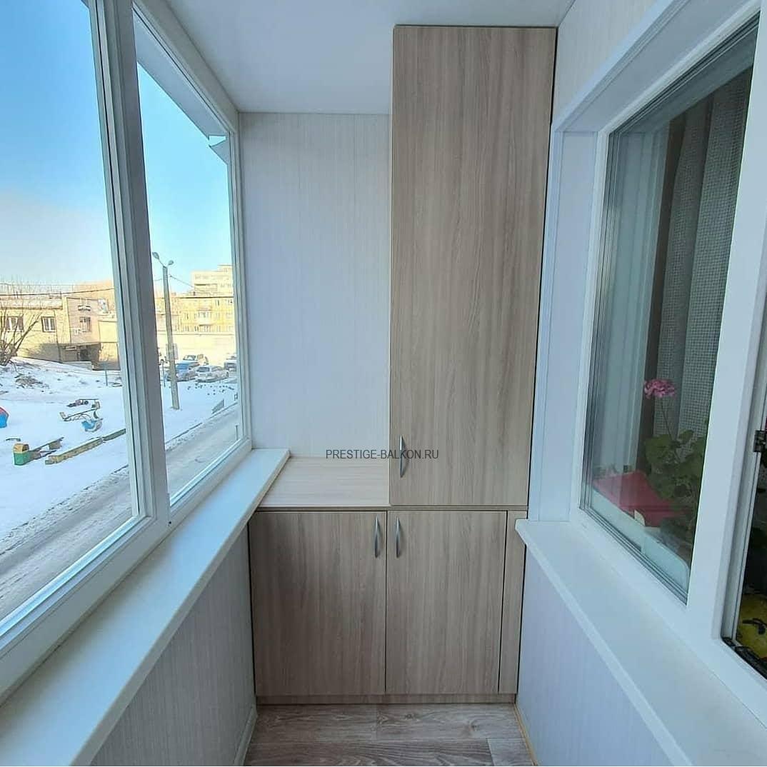 Первым этапом произведена установка теплого остекления профилем Rehau Grazio 70 мм с двухкамерным стеклопакетом. Далее выполнен ремонт стен и потолка панелями ПВХ с утеплением. Возведен черновой пол из влагостойкой фанеры и поверх настелен ламинат. Проведена электрофикация, установлены розетки и выключатель. Заключительным этапом был собран шкаф из ЛДСП.