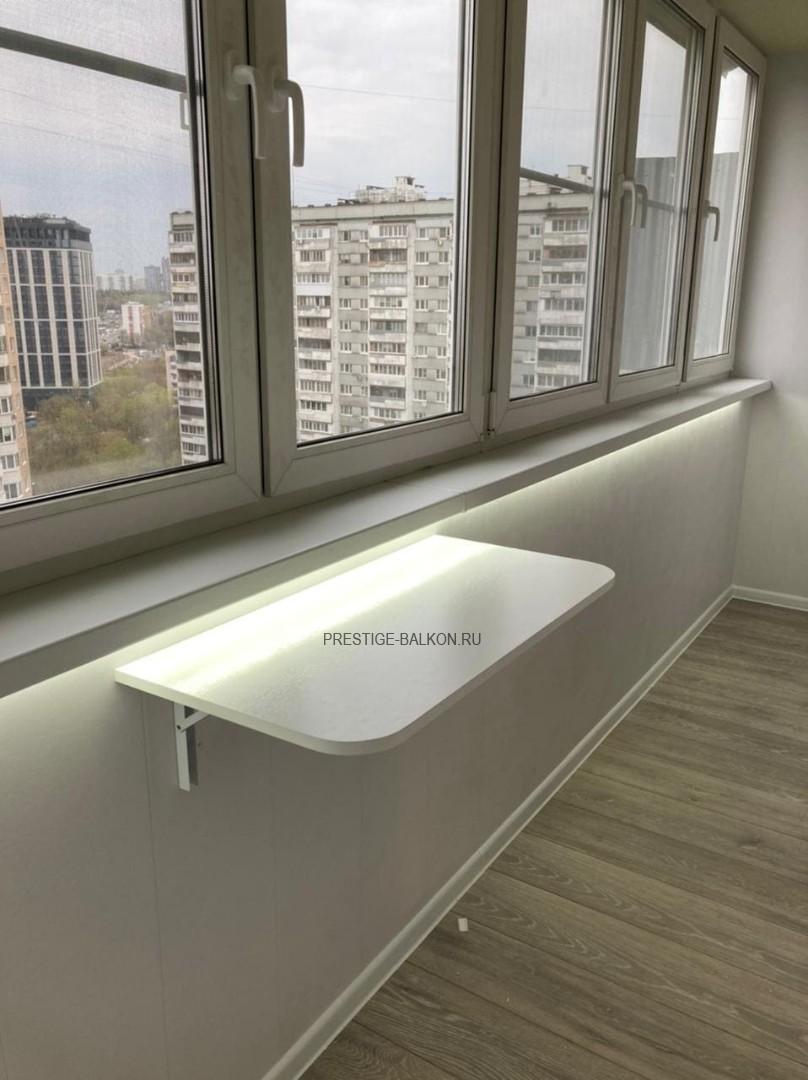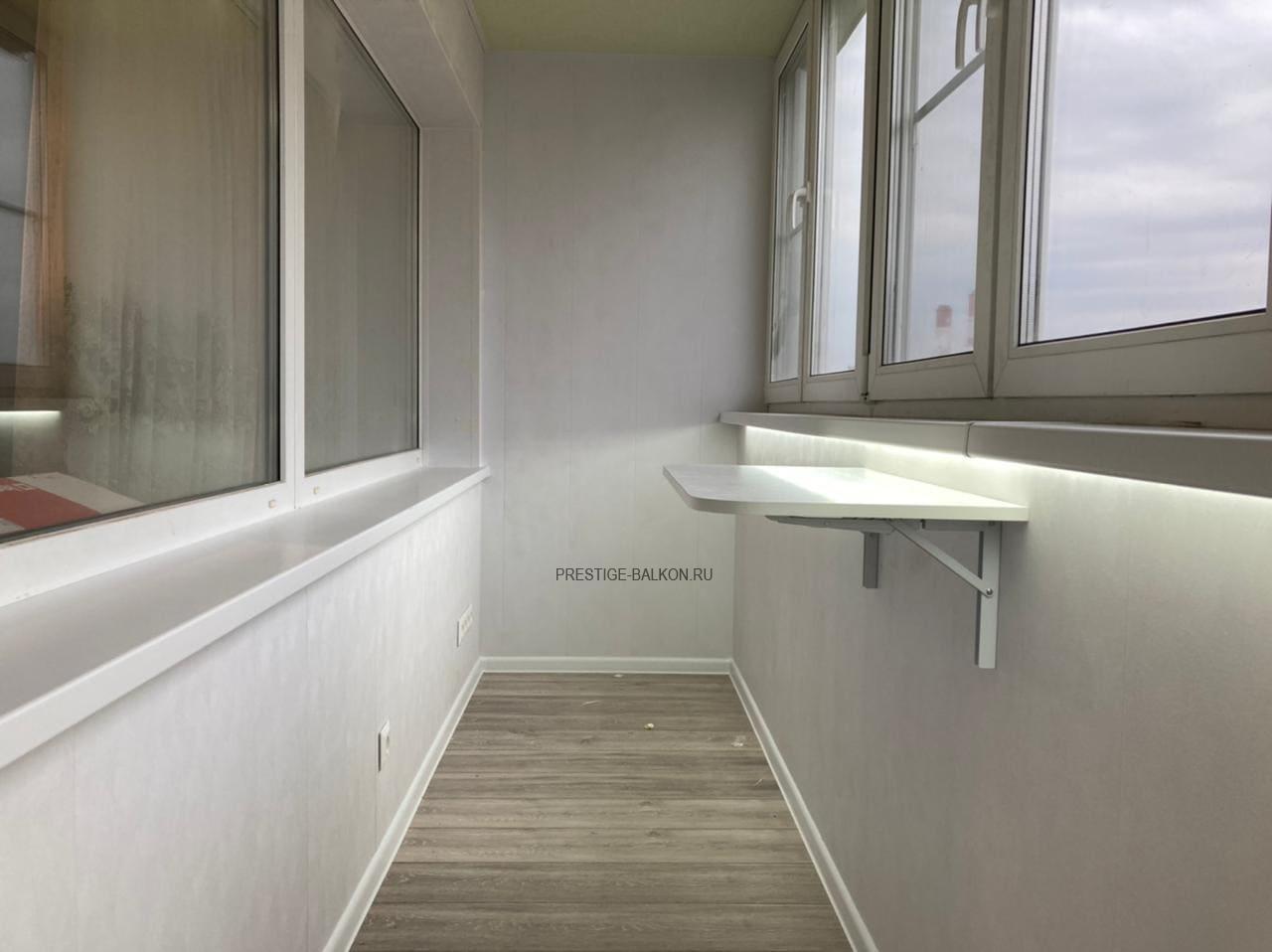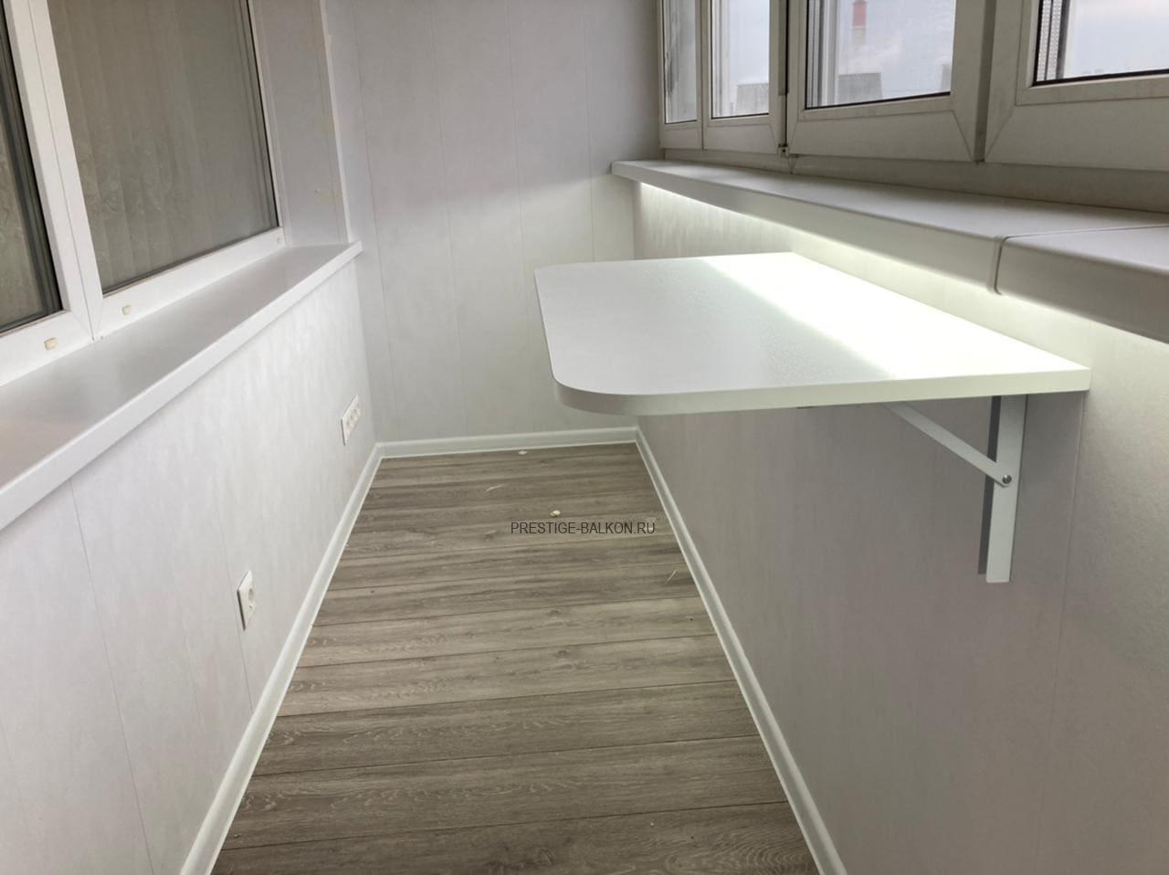 Проведено двухслойное утепление пола, потолка и всех стен контактирующих с улицей. Настелен и выровнен по уровню черновой пол из фанеры, установлен теплый инфакрасный пол с автоматическим терморегулятором, поверх настелен ламированный паркет. Проведена электрофикация лоджии с установкой розеток, выключателя и освещения. Обшиты стены и потолки пластиковыми ламинированными панелями. Дополнительно установлен откидной столик и установлена светодиодная подсветка под подоконник. Все работы на объекте заняли 3 дня, изготовление окон 10 дней