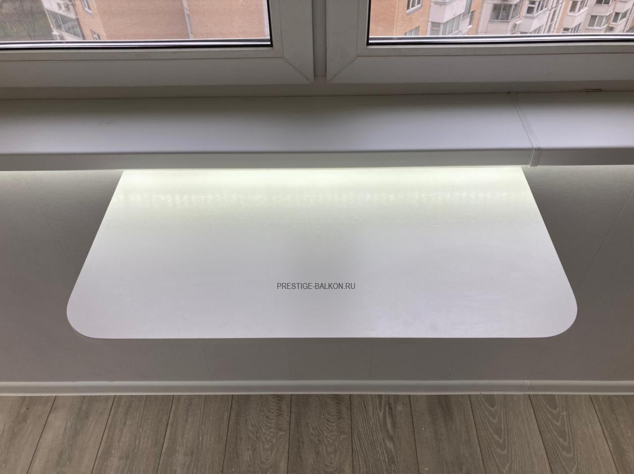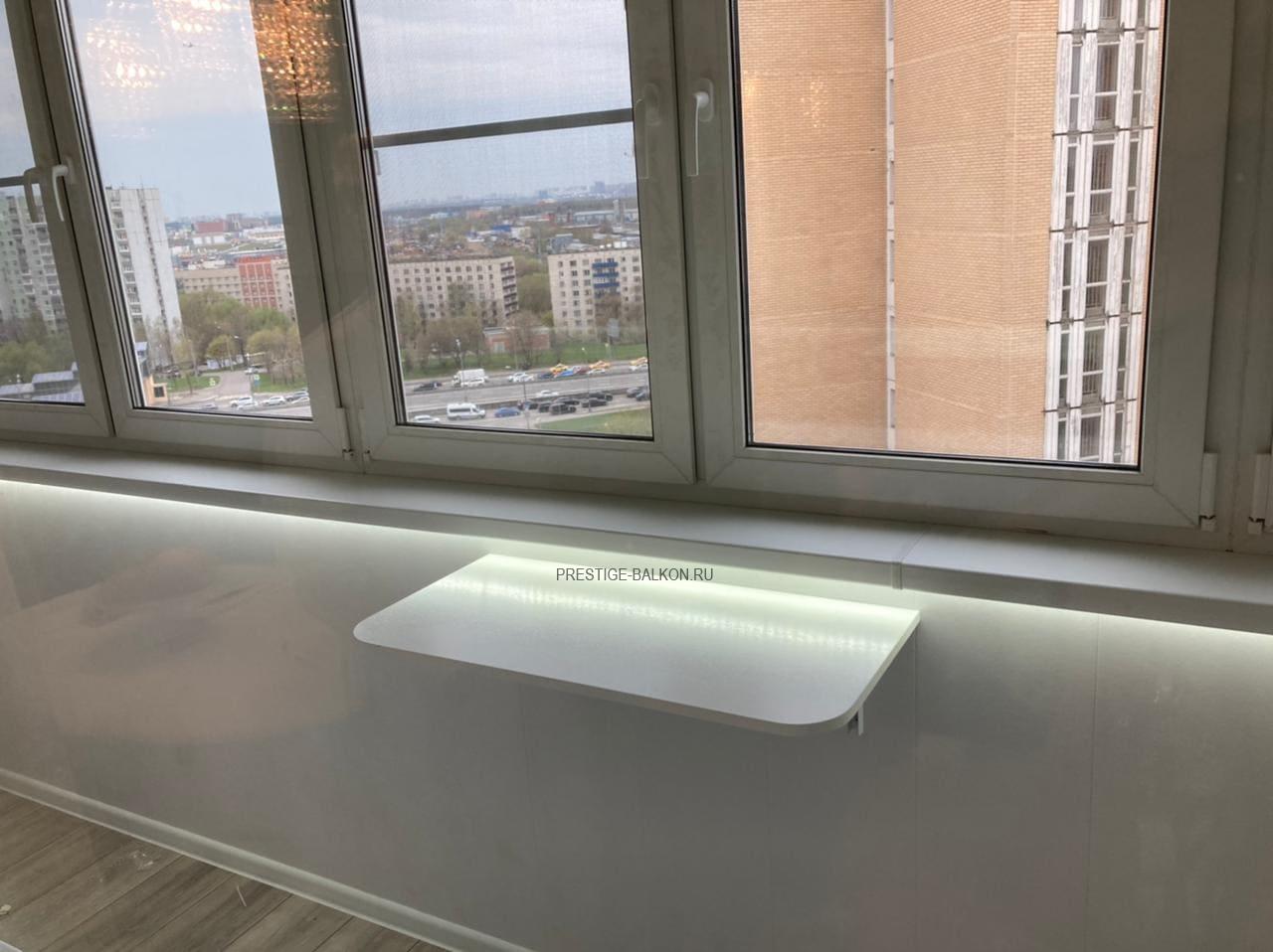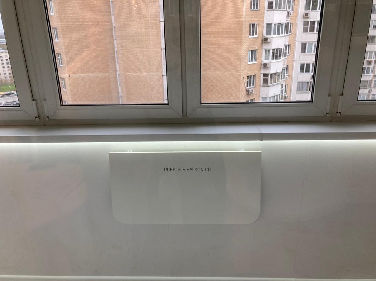 Проведено двухслойное утепление пола, потолка и всех стен контактирующих с улицей. Настелен и выровнен по уровню черновой пол из фанеры, установлен теплый инфакрасный пол с автоматическим терморегулятором, поверх настелен ламированный паркет. Проведена электрофикация лоджии с установкой розеток, выключателя и освещения. Обшиты стены и потолки пластиковыми ламинированными панелями. Дополнительно установлен откидной столик и установлена светодиодная подсветка под подоконник. Все работы на объекте заняли 3 дня, изготовление окон 10 дней