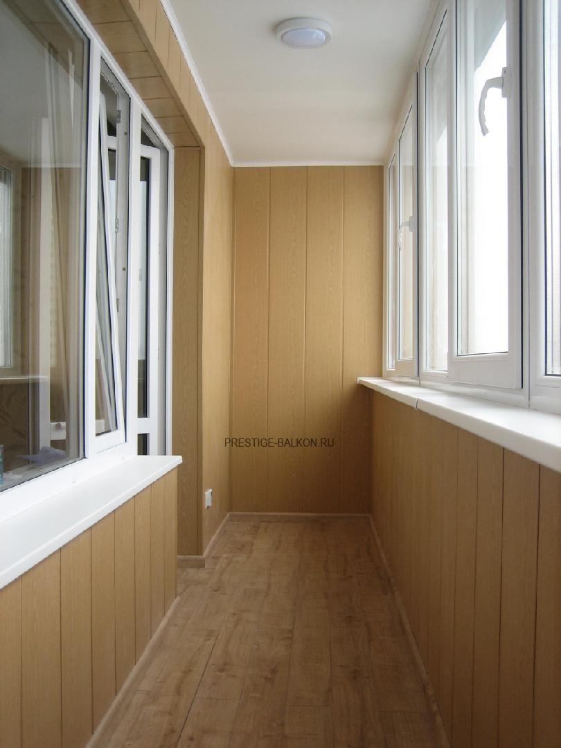 Теплое остекление лоджии пластиковыми окнами и отделка стен и потолка ламинированными панелями дает хорошее цветовое сочетание (коричневый и белый), к тому же ламинированные панели имеют больший уровень прочности.